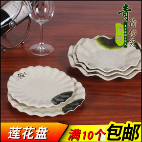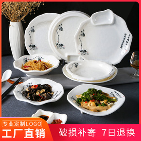 仿瓷密胺塑料盘圆形菜盘碟子秋草青荷白色酒店餐具平盘...