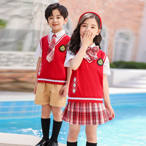 小学生夏款假两件短袖卫衣套装校服儿童装英伦学院风红...