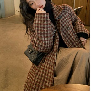 任小艺复古圣诞红色格子大衣女中长款冬2021新款夹...