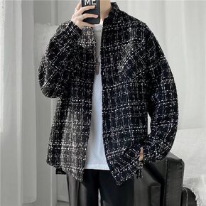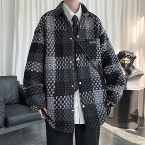 秋冬格子男士外套宽松型黑色立体贴袋单排扣少年迷彩风...