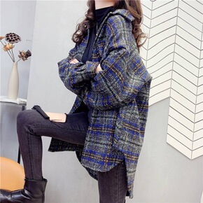 2021秋冬新款加绒加厚毛呢格子衬衫上衣磨毛外套...