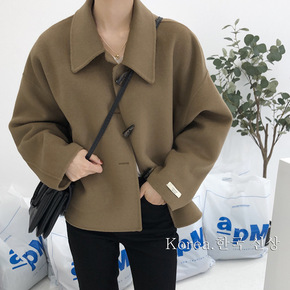 实拍小个子牛角扣毛呢大衣女短款2021冬宽松设计感...
