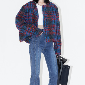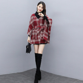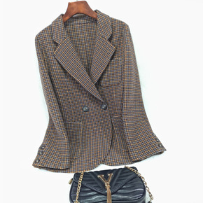原创小香风红蓝格纹羊毛毛呢外套女秋冬短款小个子呢大...