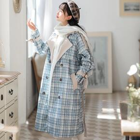 加棉加厚法式英伦风穿搭毛呢大衣女冬天复古格子小个子...