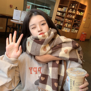 高品质双面格子爱心围巾女秋冬季时尚韩版潮百搭加厚两...