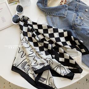 新款黑白棋盘格方巾抽象简笔复古外搭旅游发带头巾女洋...