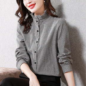 2021秋冬法式通勤立领格子衬衫复古港味设计感小众...