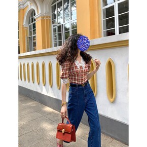 许大睛 复古红色格子衬衫女收腰显瘦2020年夏款泡...