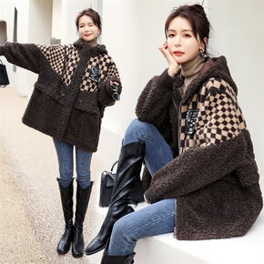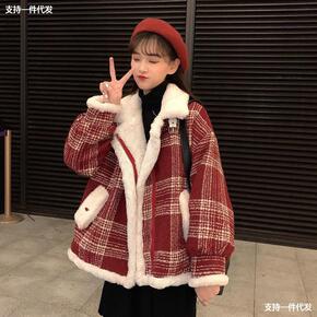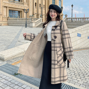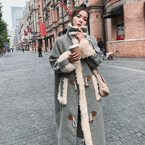 实拍新款牛角扣羊羔毛呢外套女长款冬季韩版宽松格子加...