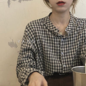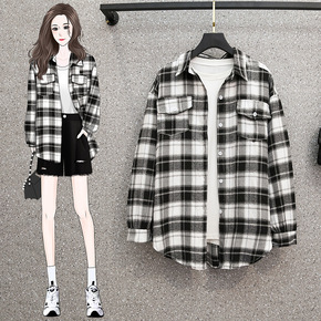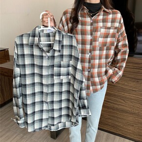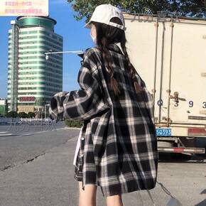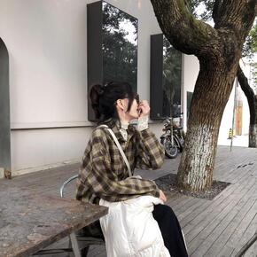 大码 2021秋装港风长袖格子衬衫女宽松慵懒衬衣外...