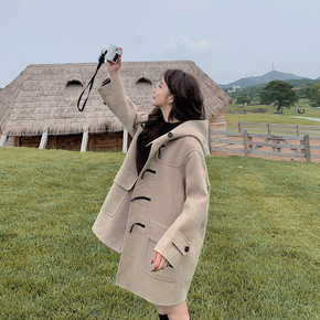 牛角扣毛呢大衣女小个子2021新款中长款学生韩版宽...