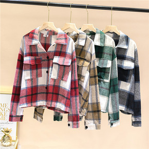 2021秋季设计感新款格子衬衣磨毛长袖短款外套衬衣...