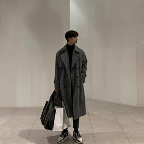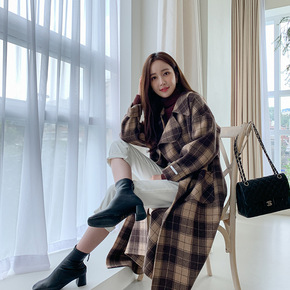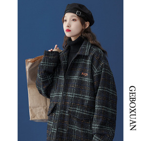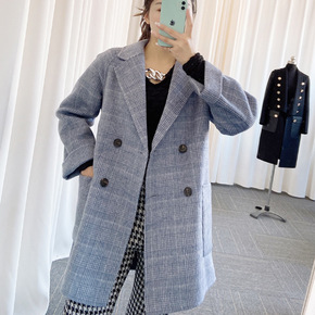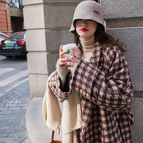 千鸟格毛呢外套女冬加厚中长款2021新款韩版宽松气...