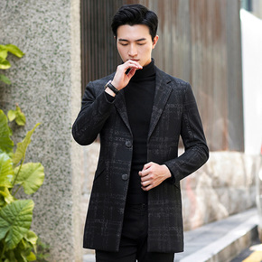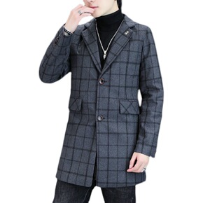 秋冬韩版修身毛呢大衣男士潮流格子风衣外套男呢子上衣...