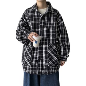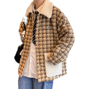 男士港风格子毛外套男秋冬季潮流大衣加厚夹克外套...