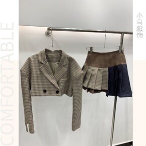 小香风早秋套装女泡泡袖短款千鸟格长袖西装上衣鱼尾半...