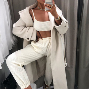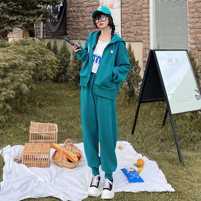 连帽休闲运动卫衣套装女2021秋季宽松华夫格开衫外...