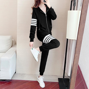 运动套装女秋TB爆款华夫格面料条纹撞色拉链连外套裤...
