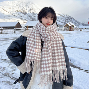 2022仿羊绒菱形格子围巾女冬季学生保暖长款加厚披...