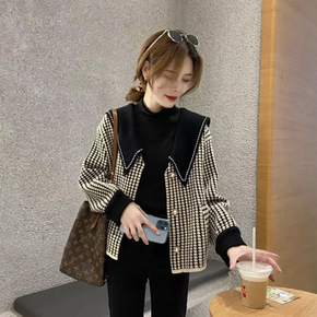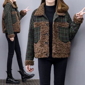 新韩版羊羔毛拼接短外套2021秋东格子毛呢短款棉衣...