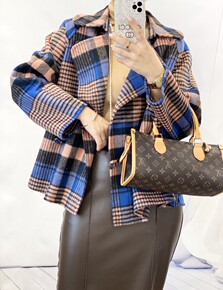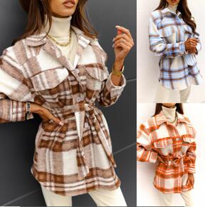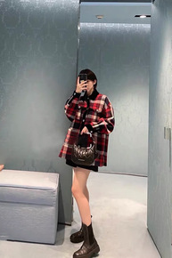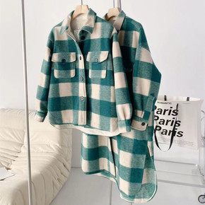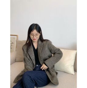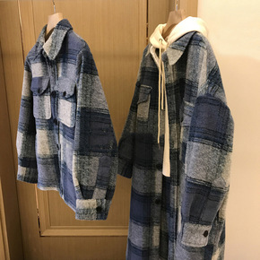 实拍2021秋冬新款韩版复古宽松格纹毛呢大衣中长款...