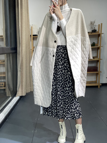 时尚洋气秋冬欧美风拼接菱形格蝙蝠棉呢大衣超宽松长外...