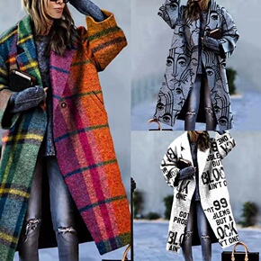 秋冬新款女士格纹撞色翻领中长款毛呢外套复古风休闲大...