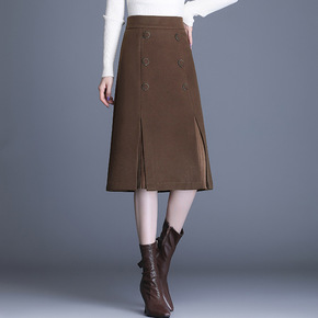 开衩百褶裙中长款A字裙冬季毛呢裙时尚新款半身裙女装...