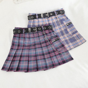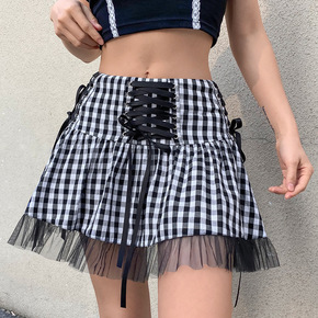ML21013暗黑撞色格纹不规则百褶裙 高腰性感哥...