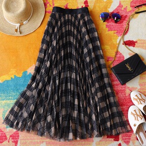 自带高颜值-气质得发光!四季可穿!格纹印花百褶网纱...