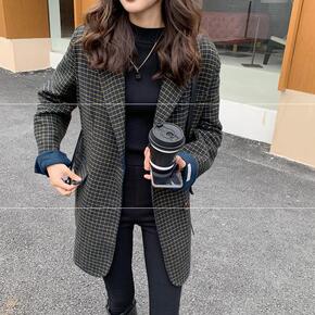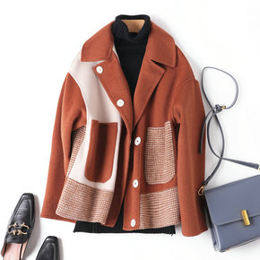 韩国双面羊绒大衣女短款撞色复古格子西装东大门羊毛呢...
