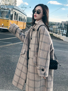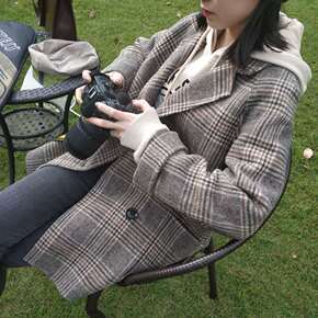 韩国东大门宽松休闲格子双面羊绒大衣外套...