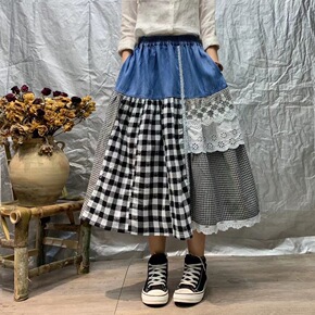 森女新款女装文艺甜美松紧腰层层刺绣花边格子半身裙棉...