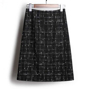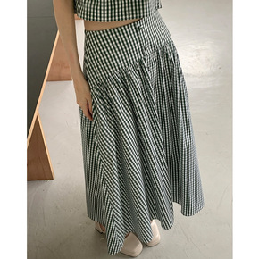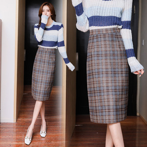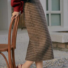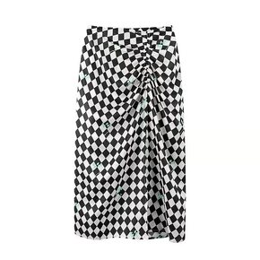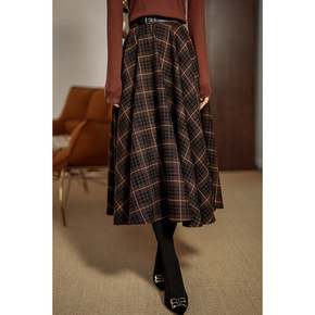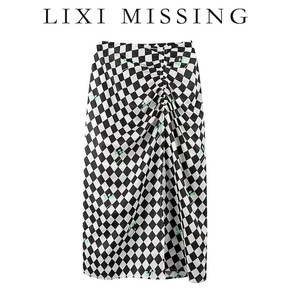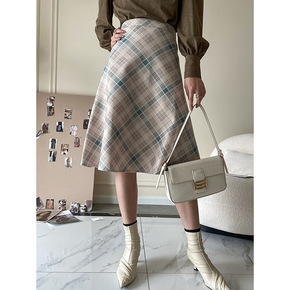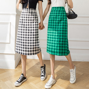 2022春季新品高腰钉钻腰带开叉中长款格子半身裙女...