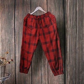 2022春夏新款中年格子文艺复古棉麻格子七分裤宽松...