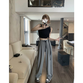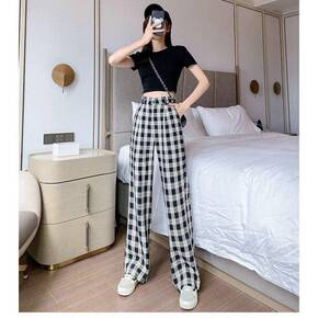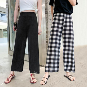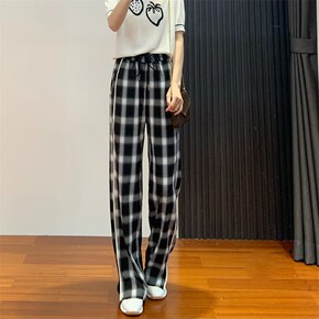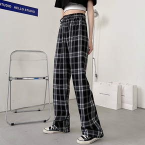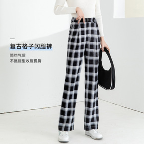 2022新款冰丝阔腿裤格子裤子女宽松韩版直筒垂感春...