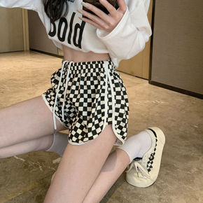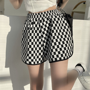 2022夏季新款韩版松紧腰黑白格子休闲短裤女大码宽...