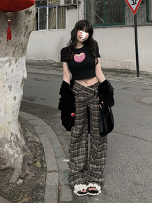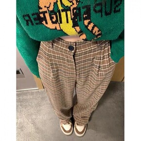 棕色格子阔腿裤女春夏新款美式hiphop复古高腰休...