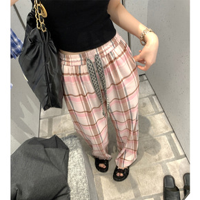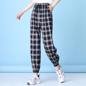 运动休闲裤女夏季宽松束脚哈伦裤松紧腰薄款大码高腰格...