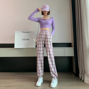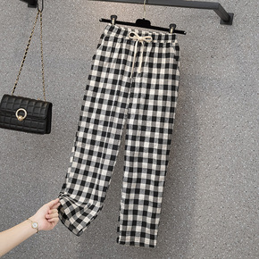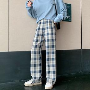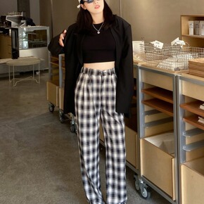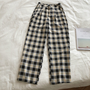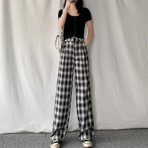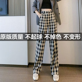 高腰显瘦直筒格子休闲裤女 韩版宽松阔腿长裤2021...