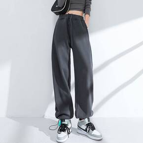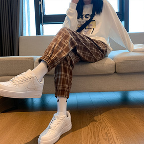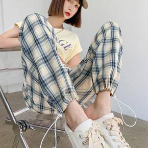 网格裤子女夏 格子裤灰色运动裤女宽松束脚阔腿裤休闲...