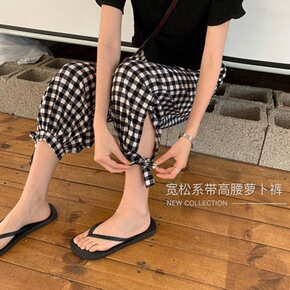 高腰格子阔腿裤大码夏季薄款灯笼裤女格子阔腿裤女20...