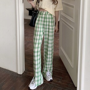 格子裤女春秋宽松直筒裤子绿色高腰显瘦阔腿裤夏季薄款...