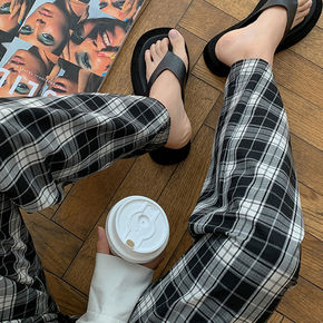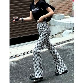 网格裤格子裤女秋直筒宽松阔腿裤黑白拖地高腰垂感薄款...
