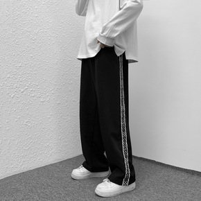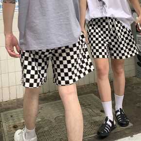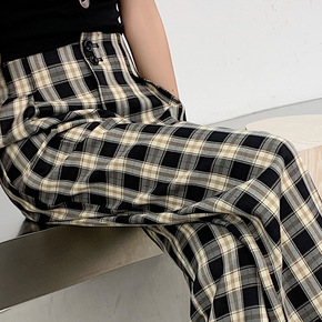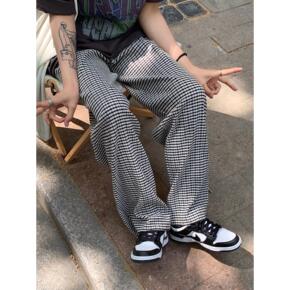 2021自制阔腿裤街头运动风黑白棋盘格子休闲宽松直...
