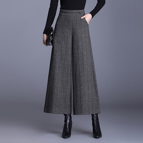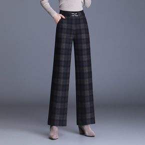 坠感阔腿裤女秋冬大码宽松休闲直筒裤九分毛呢格子裤高...