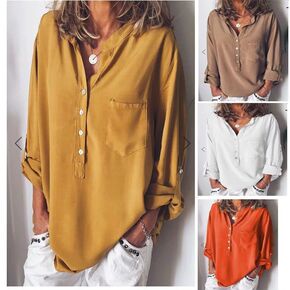 2019春秋 外贸欧美女装纯色长袖衬衫时尚款式V领...