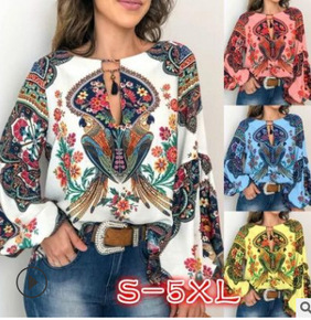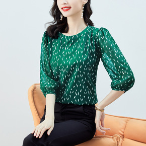新款女装个性女装数码印花圆领灯笼袖衬衣...
