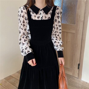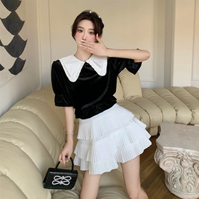 实拍2021丝绒撞色娃娃领甜美植绒衬衫+气质百搭背...