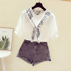 C6963 2022春装新款女装新款印花领口压褶拼...